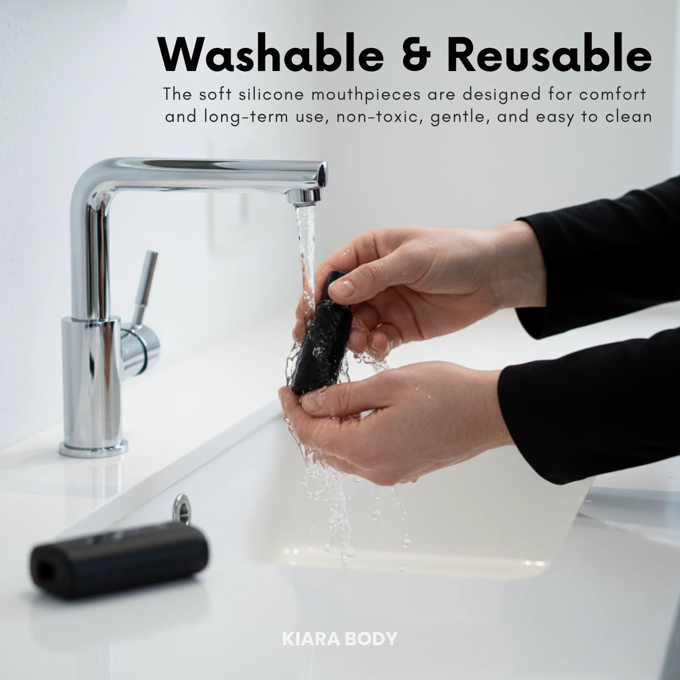 After each session, rinse the mouthpiece with warm water. Once daily, wash it gently with mild soap and let it air dry. The device body can be wiped with a clean, dry cloth.